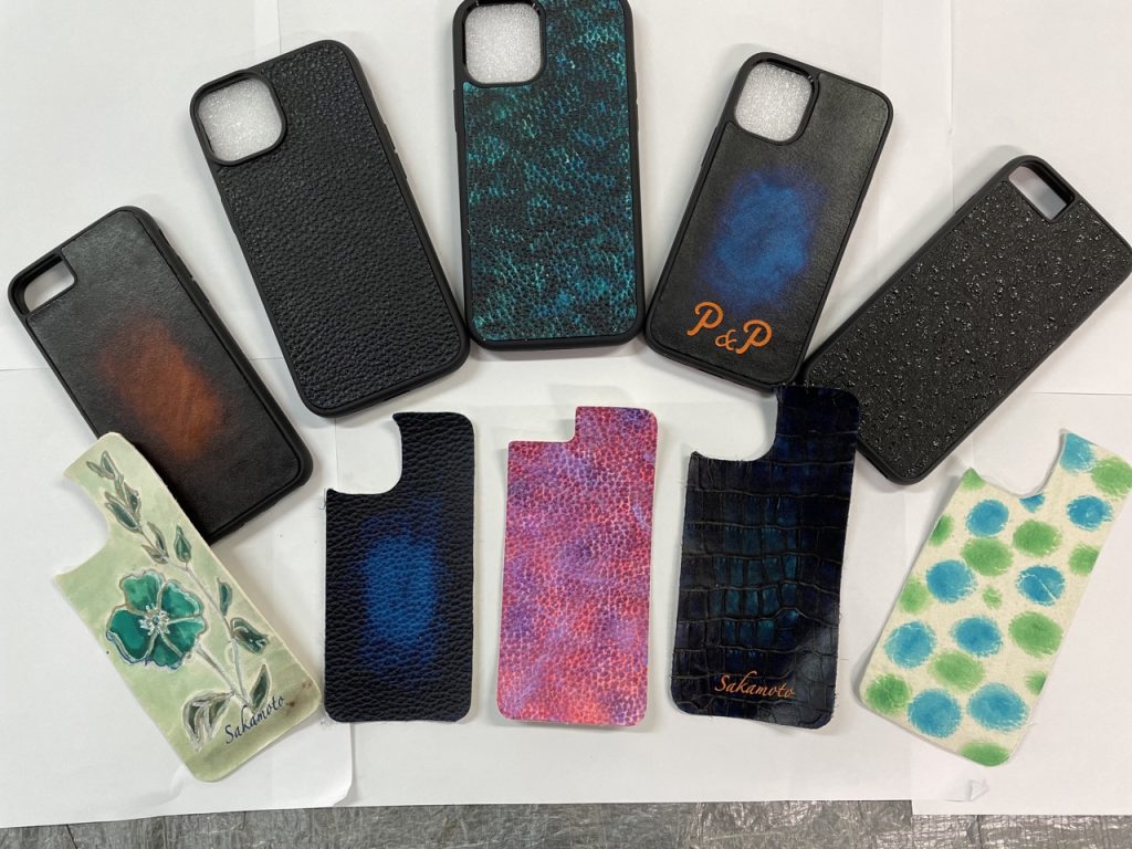 iPhone のサイズに合ったスマホケースに染色した革を貼り付けて出来上がりです。